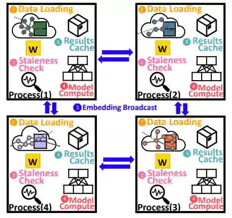 (5)在广播之前,更新的嵌入被分派到下一迭代的陈旧性检查中。