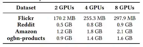 在 SANCUS 训练过程中,GPU 内存占用分为三部分:本地数据(即嵌入、本地邻接矩阵和全权矩阵)、矩阵运算内存和历史嵌入缓存。与 CAGNET 相比,SANCUS 唯一额外消耗的是历史嵌入缓存。因此,下表说明了缓存占用情况。总的来说,对于现代 GPU 来说,缓存成本很低。