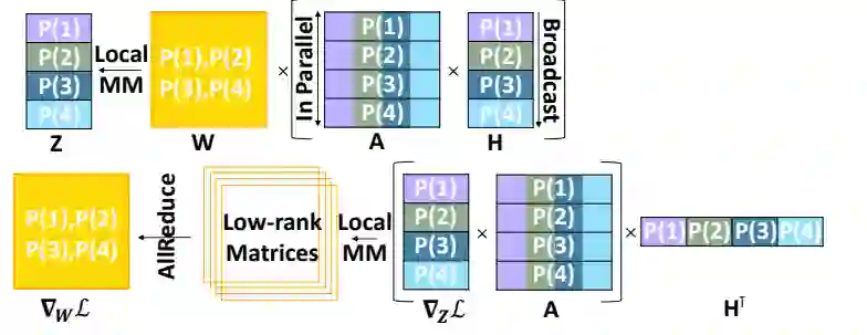 训练过程如上图所示,将分布式 GNN 视作矩阵乘法序列,以避免聚合过程中密集的邻居获取。邻接矩阵 A 和嵌入矩阵 H 被分块存放到不同的设备,对并行的分布式进程 P(i),定义了矩阵乘法的中间结果