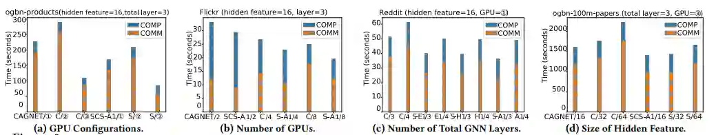 接下来,用表现最差的 SANCUS 变体 SCS-E1/A1/H1(避免通信最少)演示通用性。下图根据 GPU 配置、GPU 数量、GNN 总层数和 ogbn-products、Flickr、Reddit 和 ogbn-papers100M 上的隐藏特征大小来表示系统的变量。