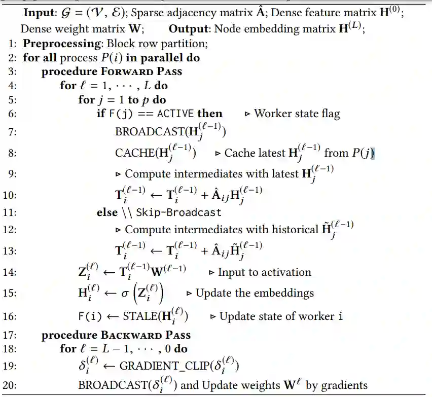 SANCUS 的传播算法如上图所示。计算设备并行分别对每个层进行训练。在向其他设备广播之前,先检查进程 j 的嵌入的陈旧性。若进程状态是活跃,则将
