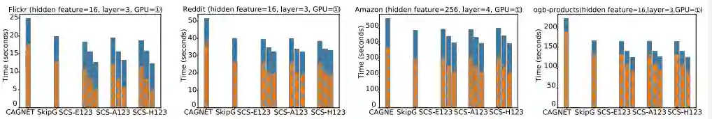 数据集以规模递增顺序展示,以此展示模型的可扩展性。图中只展示精度损失在 0.01 以内的结果。与 SOTA 工作 CAGNET 和有界梯度法 SkipG 相比,我们的所有系统进一步避免了至少 35% 到 74% 的通信。虽然基于传统梯度陈旧度的 SkipG 也优于 CAGNET,但它以准确性为代价。此外,如图所示,在不同的数据集上,SANCUS 的各种变体仍比 SkipG 获得了 29% 到 63% 的通信降低。SANCUS 在 Flickr 上使用 SCS-H3(=0.03)避免了约 74% 的通信,在 Reddit 上使用 SCS-A3 避免了 48% 的通信,在 ogbn-products 上使用 SCS-H3 避免了 50% 的通信。