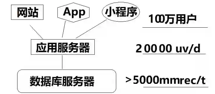事物总是在发展之中的,只要系统正常运行,总有一天用户量会加大,随之而来的请求会超乎你的想象(前提你是做了 pv, uv 的数据分析),很快这种架构会遇到用户超过 100 万,日访问量超过 20 万,峰值并发 2 万,而数据库的表会趋近于亿级的量。