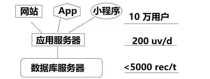 往往项目初期,为了迅速的证明自己的点子靠谱,拿到市场,我们会选择这样的架构来实现产品。此时往往 10 万用户注册了,但每天访问的人数刚过 200,每张数据库表的总数,最大也不会超过 5000 条。