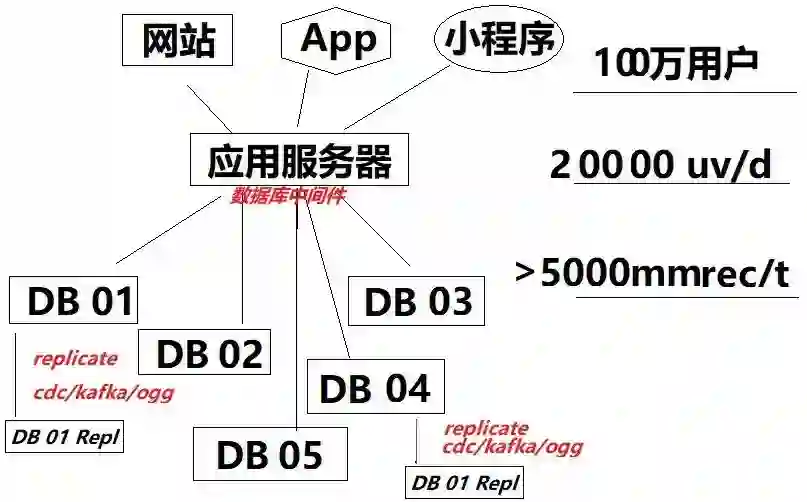 将一个大库拆成若干小库,保持数据库对象都一致,这样每个小库分摊掉一部分流量,应用终将回归第一种简单架构上来,将用户服务好。