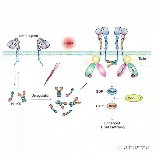 图示:发热通过Hsp90-α4整合素热感应信号通路促进T淋巴细胞迁移