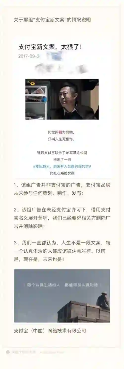 支付宝方面称,该组广告在未经支付宝许可下,借用支付宝名义展开营销,已经要求相关方删除广告并消除影响。并表示:我们一直认为,人生不是一段文案,每一个认真生活的人都应该被认真对待。以前是,现在是,未来也是。
