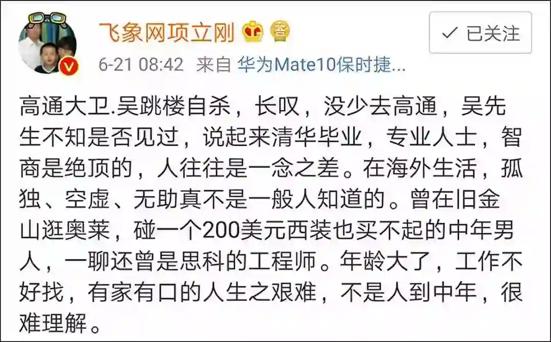 而祸不单行的是,今年 4 月,高通再度宣布裁员 1500 人,而大卫·吴再度进入裁员名单,而这一次 CEI 级别的他,连裁员补偿都拿不到。可能正是这种打击,让他走上了六楼的天台。