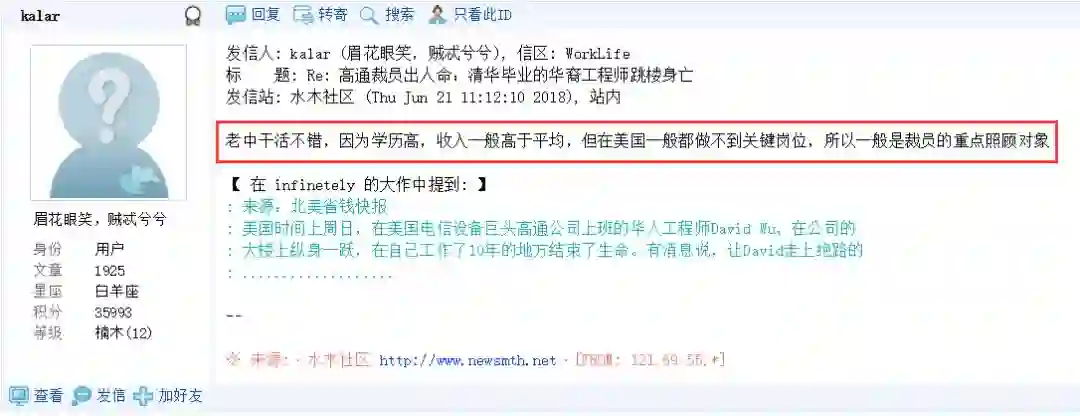 在清华水木社区论坛上,也有网友对此事件评论称,“老中(在美华人的一种自称)干活不错,因为学历高,收入一般高于平均,但在美国一般都做不到关键岗位,所以一般是裁员的重点照顾对象”。