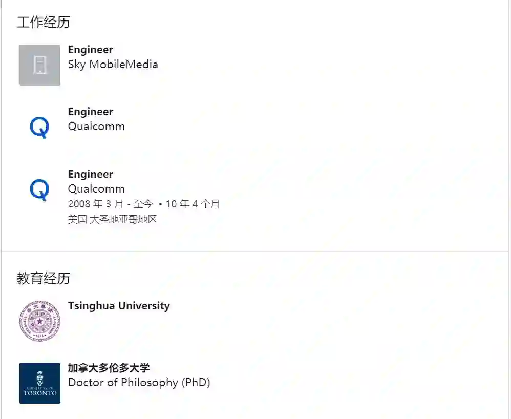 领英资料显示,他毕业于清华大学,后到多伦多大学攻读博士,2008 年进入高通,担任基带集成(Modem Integration)部门的全职工程师。