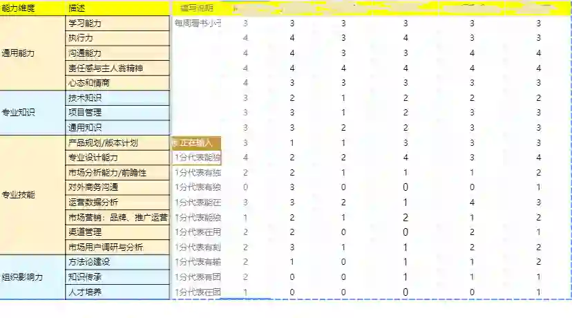 第一步,我会让大家在产品经理能力模型表里做一个能力自查,这样可以让大家非常清晰的了解各自能力情况。