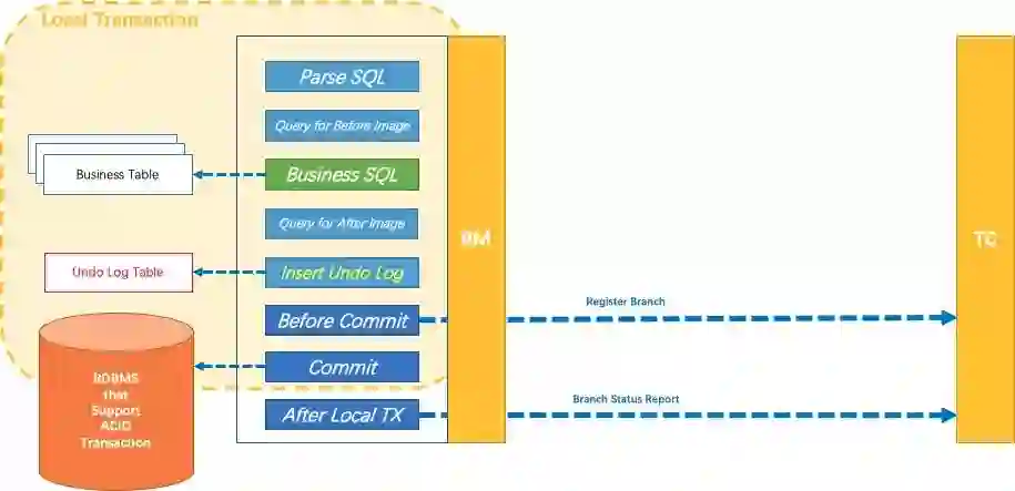 综上所述,RM模块通过对JDBC数据源进行代理,干预业务SQL执行过程,加入了很多流程,比如业务SQL解析、业务SQL执行前后的数据快照查询并组织成UndoLog、全局锁检查、分支事务注册、UndoLog写入并随本地事务一起Commit、分支事务状态上报等。通过这种方式,Fescar真正做到了对业务代码无侵入,只需要通过简单的配置,业务方就可以轻松享受Fescar所带来的功能。