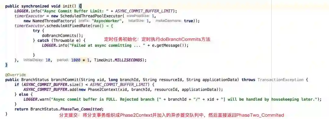 在接收到TC发起的全局提交消息后,经RmRpcClient对通信协议的处理,再交由RMHandlerAT来完成对分支事务的提交,分支事务提交从RMHandlerAT.doBranchCommit()开始,但最后由AsyncWorker异步Worker完成,直接看AsyncWorker中的代码实现: