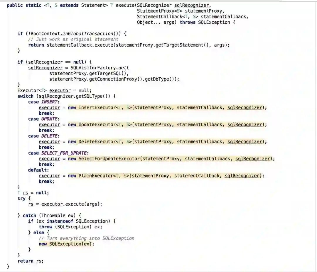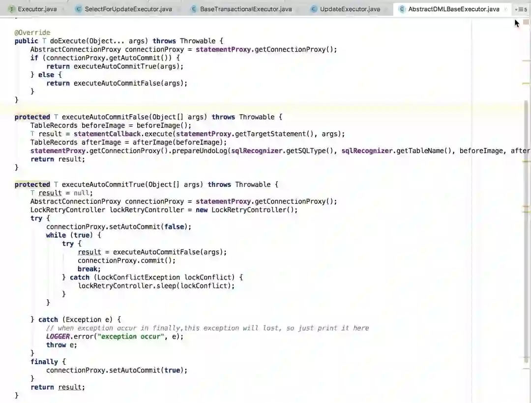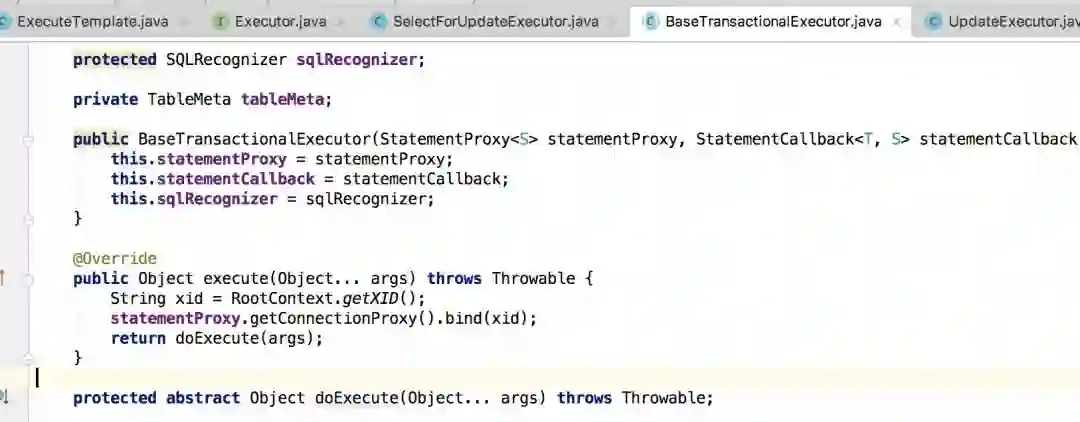 为结省篇幅,选择UpdateExecutor实现源码看一下,先看入口BaseTransactionalExecutor.execute,该方法将ConnectionProxy与Xid(事务ID)进行绑定,这样后续判断当前本地事务是否处理全局事务中只需要看ConnectionProxy中Xid是否为空。