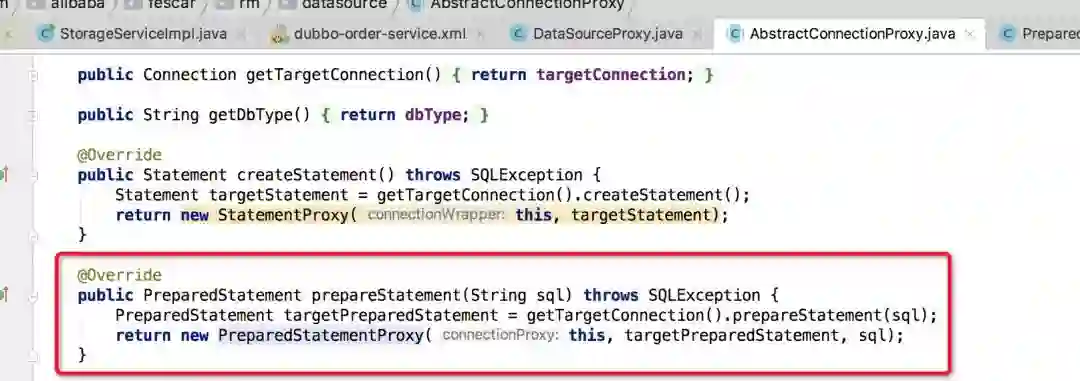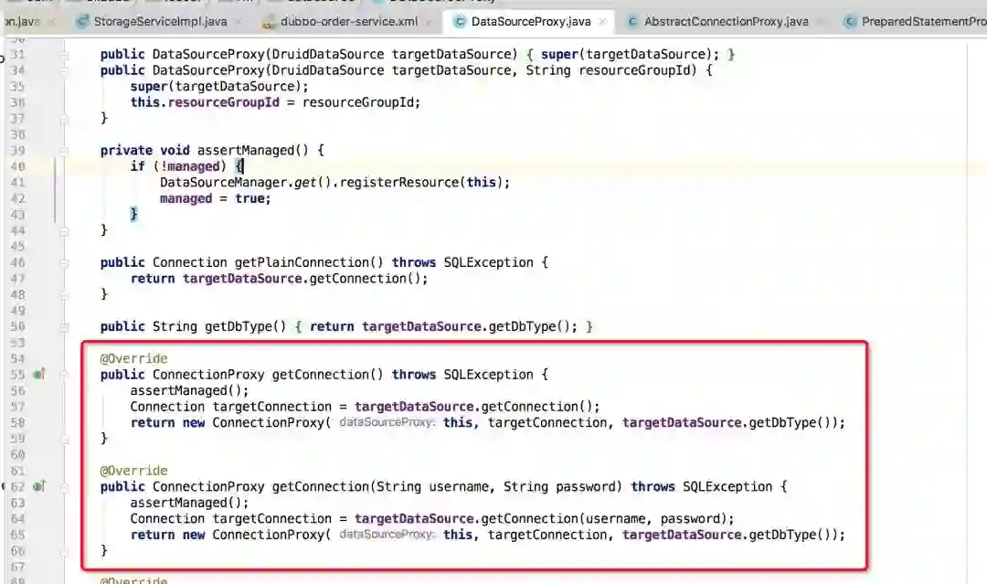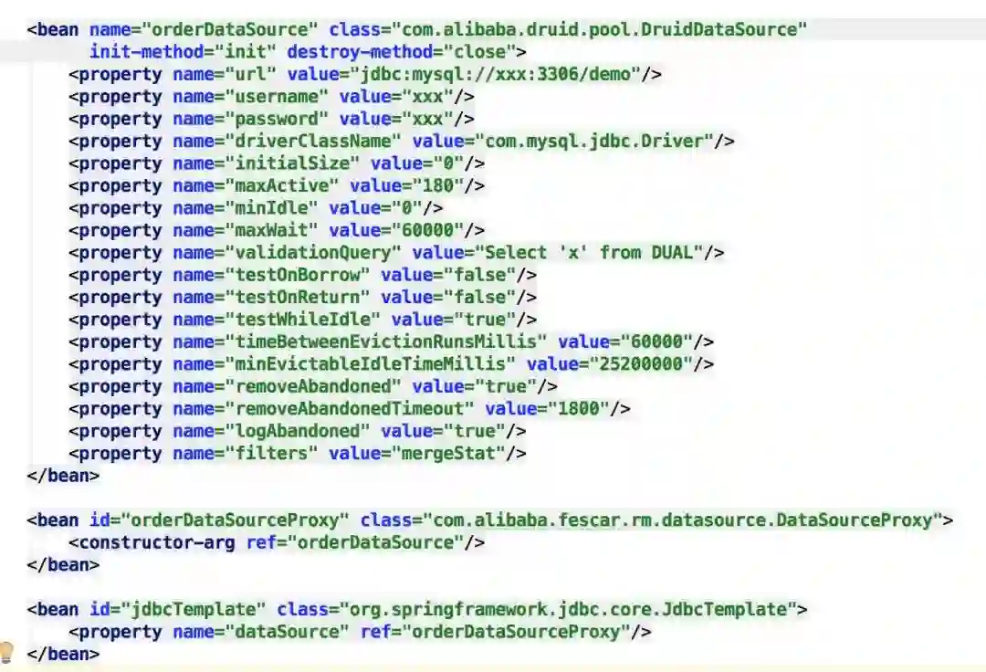 上图是Fescar源码examples模块dubbo-order-service.xml内的配置,数据源采用druid的DruidDataSource,但实际jdbcTemplate执行时并不是用该数据源,而用的是Fescar对DruidDataSource的代理DataSourceProxy,所以,与RM相关的代码逻辑基本上都是从DataSourceProxy这个代理数据源开始的。