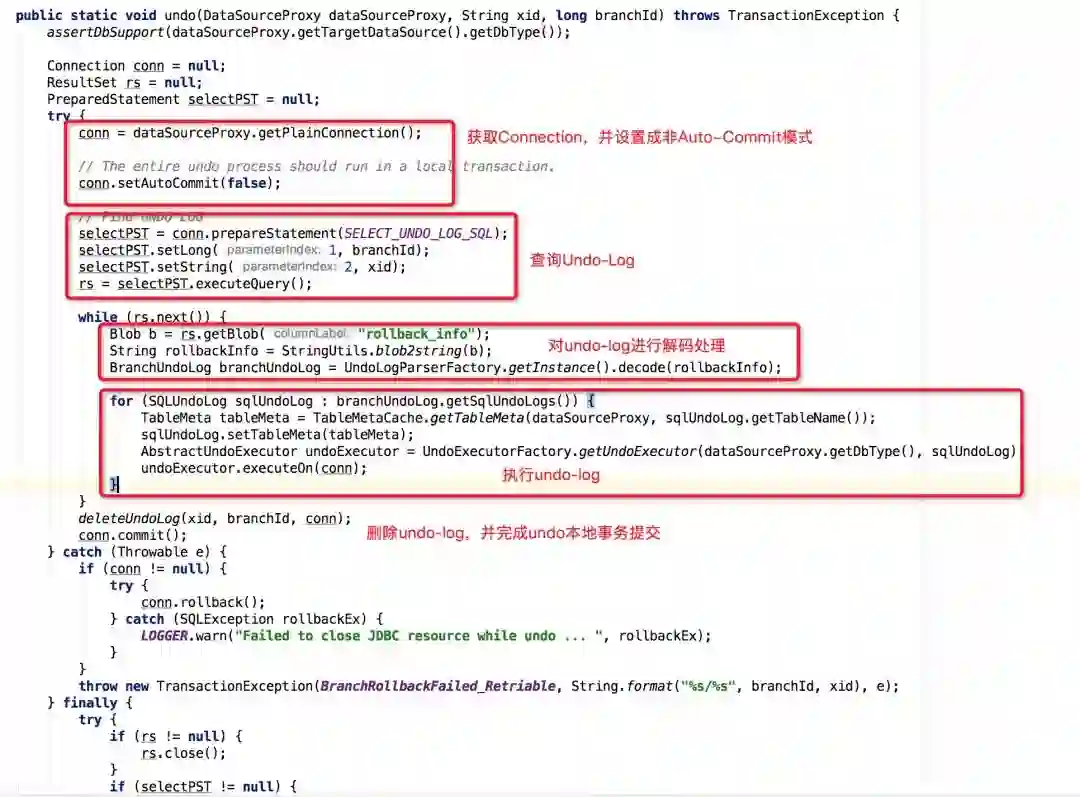同样,分支事务回滚是从RMHandlerAT.doBranchRollback开始的,然后到了dataSourceManager.branchRollback,最后完成分支事务回滚逻辑的是UndoLogManager.undo方法。