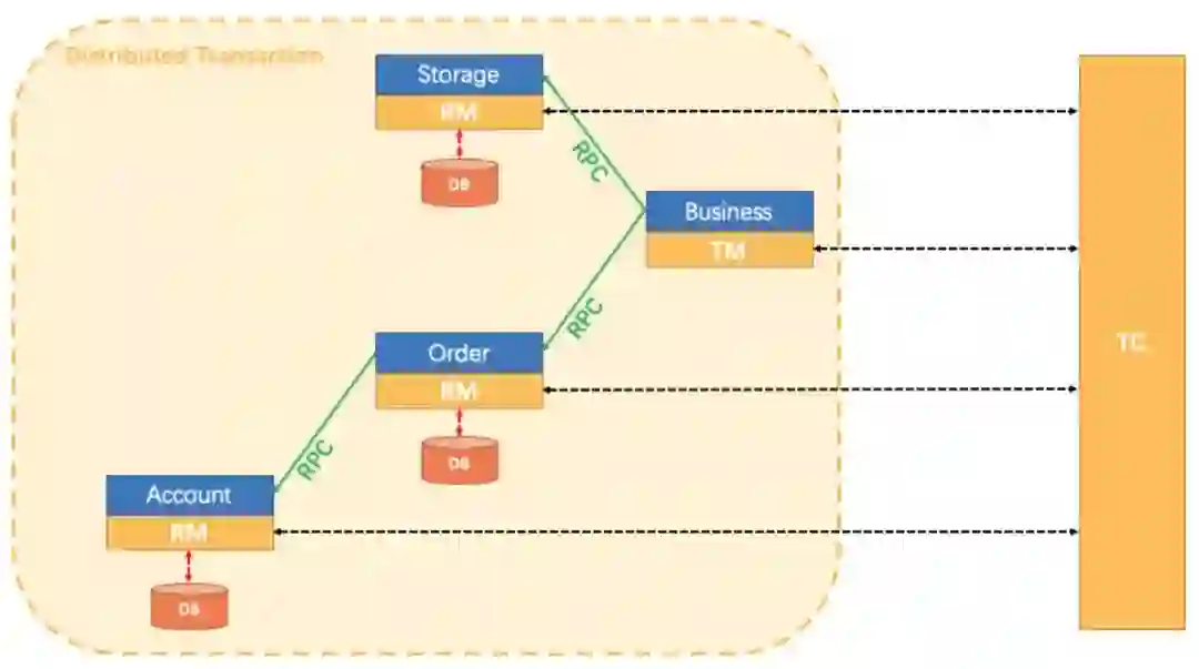 目前分布式事务解决方案基本是围绕两阶段提交模式来设计的,按对业务是有侵入分为:对业务无侵入的基于XA协议的方案,但需要数据库支持XA协议并且性能较低;对业务有侵入的方案包括:TCC等。Fescar就是基于两阶段提交模式设计的,以高效且对业务零侵入的方式,解决微服务场景下面临的分布式事务问题。Fescar设计上将整体分成三个大模块,即TM、RM、TC,具体解释如下:
