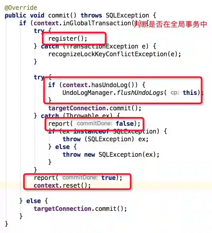 如果本地事务执行过程中发生异常,业务上层会接收到该异常,至于是给TM模块返回成功还是失败,由业务上层实现决定,如果返回失败,则TM裁决对全局事务进行回滚;如果本地事务执行过程未发生异常,不管是非Auto-Commit还是Auto-Commit模式,最后都会调用connectionProxy.commit()对本地事务进行提交,在这里会创建分支事务、上报分支事务的状态以及将UndoLog持久化到undo_log表中,具体代码如下图: