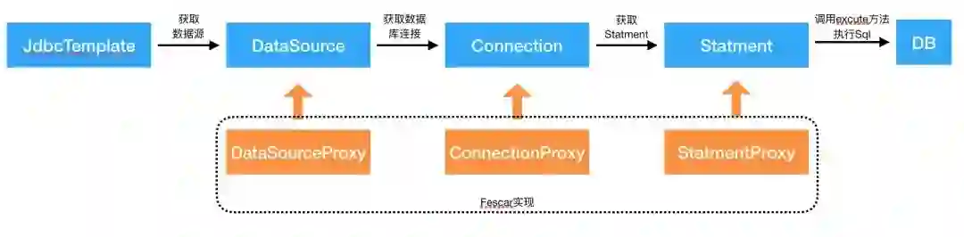 由于在配置中,JdbcTemplate数据源被配置成了Fescar实现DataSourceProxy,进而控制了后续的数据库连接使用的是Fescar提供的ConnectionProxy,Statment使用的是Fescar实现的StatmentProxy,最终Fescar就顺理成章地实现了在本地事务执行前后增加所需要的逻辑,比如:完成分支事务的快照记录和分支事务执行状态的上报等等。