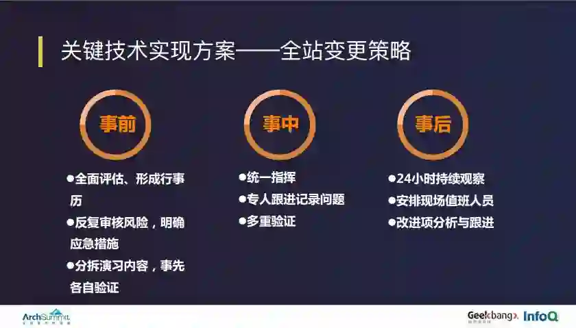 除了切换工具,在整个切换过程中都会贯穿事前、事中和事后这三个步骤。我们要求的是,事前做好充分准备,事中做到统一行动,事后做到持续监控、观察和总结。