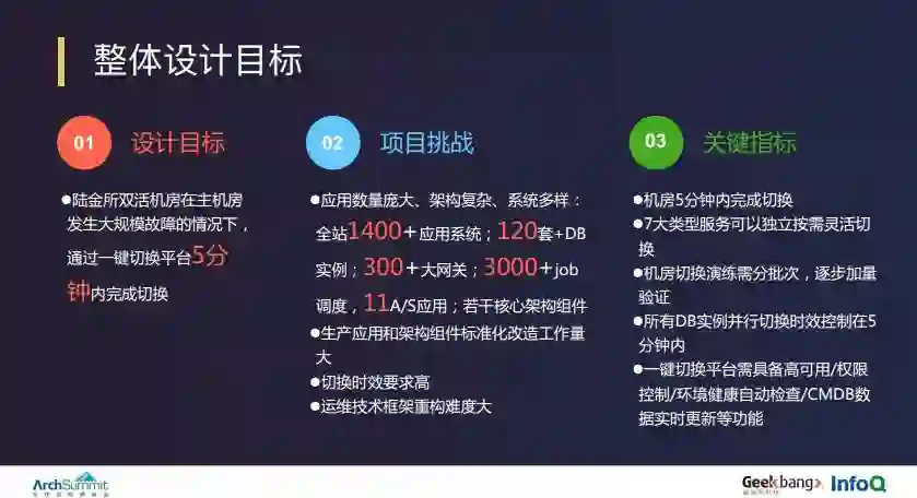 陆金所发展到现在已经是个很庞大的系统,包含超过 1400 个子应用,120 套 DB 实例,300 个大网关,3000 个 Job 调度,非自研、非外购的不能做双活的主备系统,基于状态的核心组件,例如分布式锁、文件系统等等。基于这样庞大的应用系统,想要在 5 分钟之内完成主机房全部组件的角色切换,难度是显而易见的。