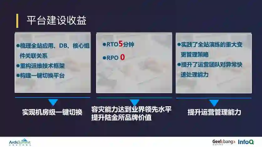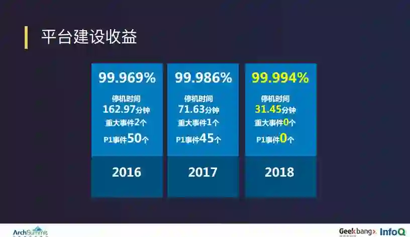 上图是直接带来的收益数据,陆金所本身的业务每年也在呈几何增长,但我们的服务支持、可用性在 2018 年达到了一个很好的水平,这完全依赖整个切换服务和架构改造。