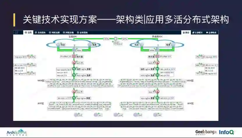 再往下就是比较标准的形态了,Web 层 Nginx 负载均衡做 7 层负载,然后通过 Web 层应用调用 App 层的 F5 和负载,触达到真正的 APP 应用,完成与数据库的交互访问。