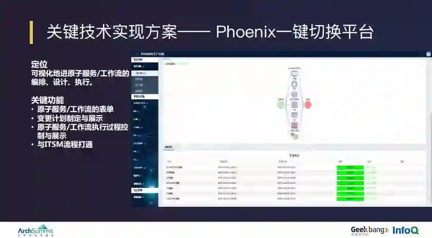 上图是我们切换平台的主界面,左边是具体的服务目录,右上是整个可视化的流程展示,右下是执行任务具体的每一个执行结点、执行时间、状态进度等等的展示。