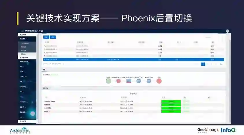 上图是整个切换平台的架构,不是特别复杂,基本上分为三个层次,第一层是交互层,主要是由 Phoenix 平台跟 LuGrafana 组成,分别用来执行切换操作和切换大盘;业务层主要是由流程引擎、服务总线和 API 网关组成;最后一层是基础层,主要是由 CMDB 配置中心、统一权限认证管理 PASSPORT、作业平台 PAVO 和配置版本中心 LuGIT 组成。