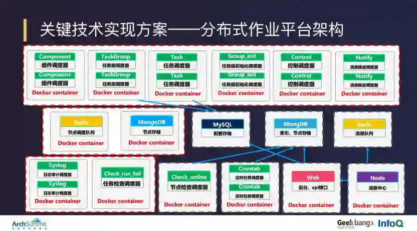 根据技术运营和日常运维的场景,陆金所自研了一套分布式作业平台,依托于微服务框架,由多个角色节点的容器组合而成,每个角色节点都可以根据自己设定的监控阈值进行水平动态伸缩,每个服务组件所负责的作业都可以按照作业特性进行全生命周期的状态管理。