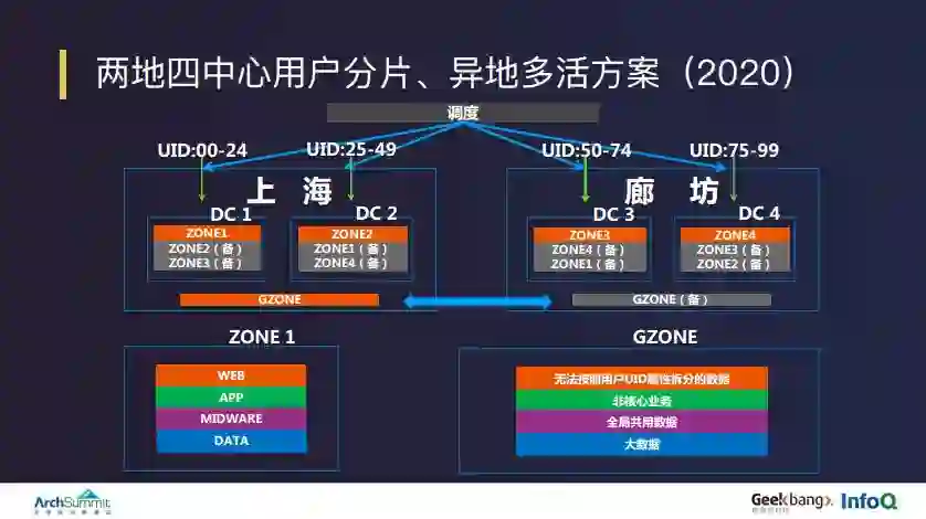 除此之外,我们现在还使用的是 Oracle、MySQL 这样的数据库,在金融行业中,我们现在看到的瓶颈或水桶原则最短的短板都是数据库,同行中的大部分企业还没有办法做到像 BAT 使用纯分布式数据库的架构来支撑。我们认为目前比较有普适价值的方式,就是去 O,通过自己的去 O 方式把 Oracle 切换效率低下、切换操作复杂、易出错的场景降到最低。当我们完成去 O 之后,就能做到基于用户级别的分库分表。这样,哪怕是在跨地域的情况下,也能做到切换过程不会因为延迟导致服务不可用或服务性能下降。