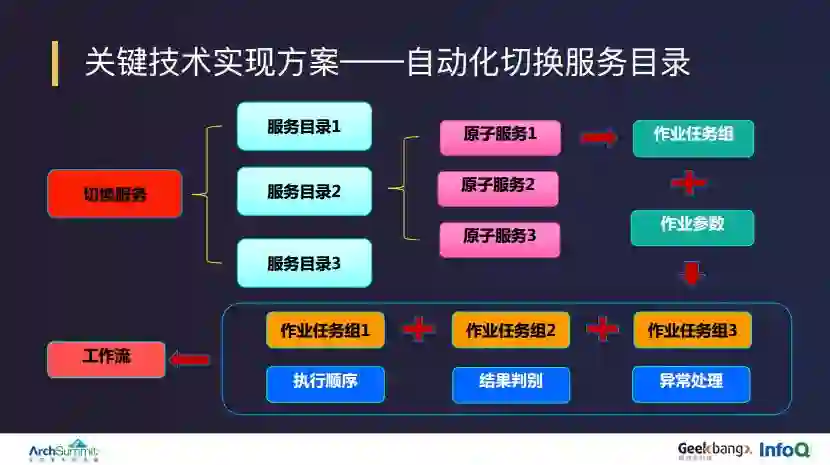 陆金所的核心切换基本上是由 7 个核心组件的切换组成,每个核心组件的切换都有个性化的切换逻辑。在设计切换平台时,我们希望切换服务目录能够更加的抽象化、通用化,所以我们采用了上图的设计模型,一个切换服务相当于是一个组合目录,由一个或者多个服务目录组成,每个切换服务目录根据自己依赖的资源,再分为一个或者多个原子切换服务,每个原子切换服务又由一个作业任务和作业参数组合而成。当这个任务组明确了作业任务以及作业参数之后,再运行,就会生成一套可编排的执行实例,所有的概念通过流程引擎进行整个调度。