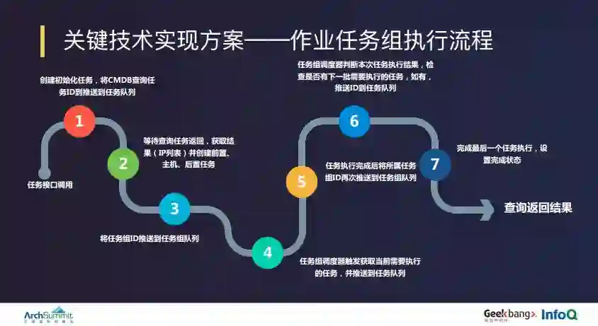 每个作业组的执行都是按照 7 个步骤,首先是下发 CMDB 主机任务,这其中有一个很关键的点——数据闭环,我们要求所有的切换作业或日常变更的数据都来自于 CMDB,最后的变更结果状态同样也要回流给 CMDB。接下来是初始化对应的后续作业任务,通过获取到的主机任务以及作业任务,把对应的任务压入任务队列,并通过任务的调度程序执行每个任务的串行或并行的任务调度与执行,任务调度结束之后,判断任务执行结果以及是否开始执行下一任务。这样往复执行,直到作业调度程度发现任务组已经全部执行完毕,汇总整个任务的执行状态,反馈给调用方。