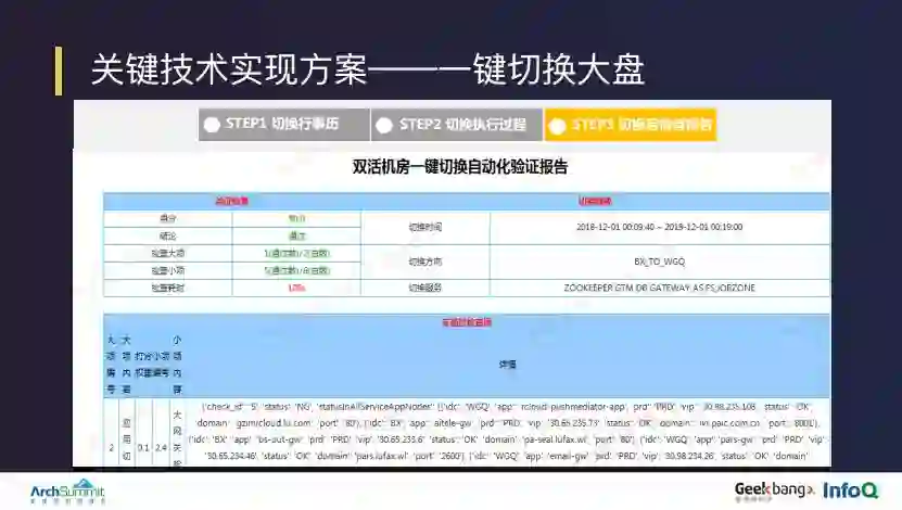 上图是切换进度页面,主要是给相对应的切换资源属组使用的,在切换过程中,各个切换的属组观察这个页面能够获取到核心组件的整体切换状态以及组件切换的里程碑。如果接着细化,可以迅速看到所负责组件的子分类和子任务的执行情况和执行耗时,当发现切换问题时能够第一时间发现并处理。