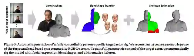为了实现这一目标,研究人员提出了一种新方法,可以快速、自动地从一个简短的RGB-D初始化序列中构建人的头部和躯干的几何代理(proxy)。这个虚拟形象具有完整头部的参数化3D模型,使用混合形状进行表情控制,并与个性化的上身模型集成。