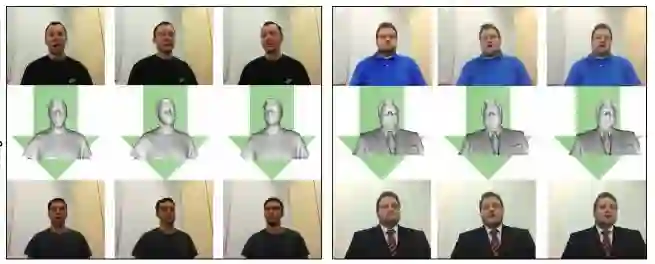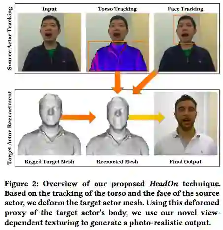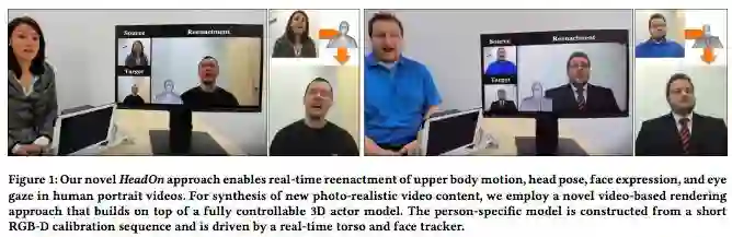 在论文中,作者进一步介绍了HeadOn,这是一个用普通RGB-D相机录制的人像视频的重演(reenactment)系统。该系统通过不仅控制面部表情的变化,而且重演了头部、上身的摆动和眼睛注视的方向,克服了当前的面部重演方法的局限性。也就是说,重演了视频中的整个人体。