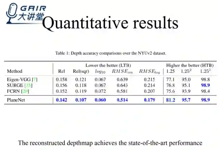 在我们的工作中,我们假定一个图像拥有十个平面,每个平面分别用三维空间中的三个参数来表示,最终确定三维结构;为了进一步确认在三维空间中的范围,我们会计算 segmentation masks;至于非平面区域,则估算 pixel-wise 的 depth map。