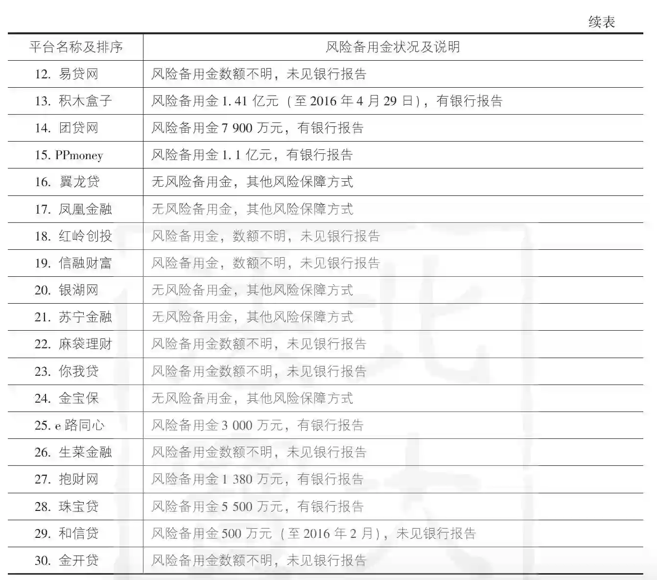 [33]在综合实力排名前三十的网贷平台中,我们仅见易贷网注明了2016年4-6月每月风险备用金垫付金额,为同行中少见,资料来源:http://www.yidai.com/fengxianjin/index, html,2016年7月25日访问。