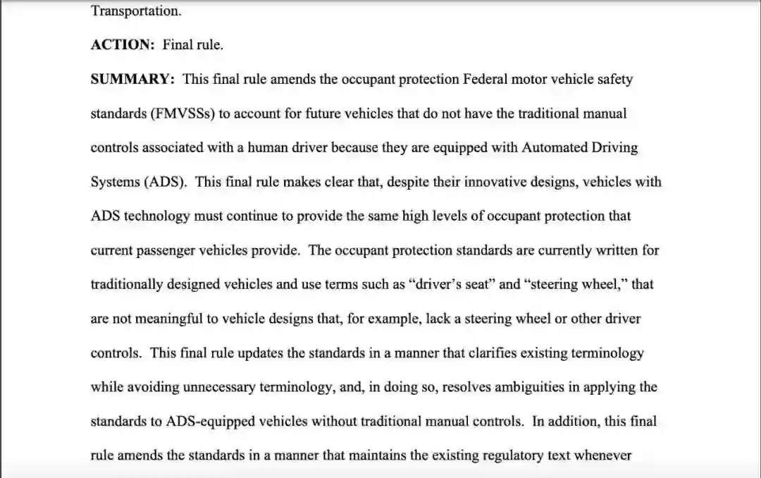 查看完整版新规:https://www.nhtsa.gov/sites/nhtsa.gov/files/2022-03/Final-Rule-Occupant-Protection-Amendment-Automated-Vehicles.pdf