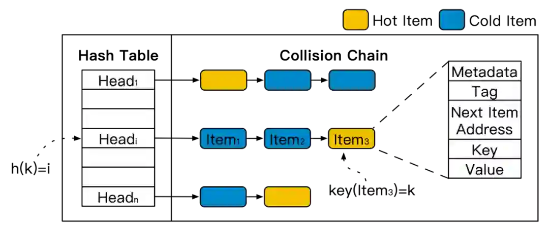 现有的内存KVS引擎通常采用链式哈希作为索引,结构如下图所示。首先,根据数据的键值(k)计算其哈希值h(k),对应到哈希表(Hash table)的某个头指针(Headi)。根据头指针遍历相应的冲突链(Collision Chain)的所有数据(Item),通过键值比较,找到目标数据。如果目标数据不在冲突链中(read miss),则可在冲突链头部插入该数据。