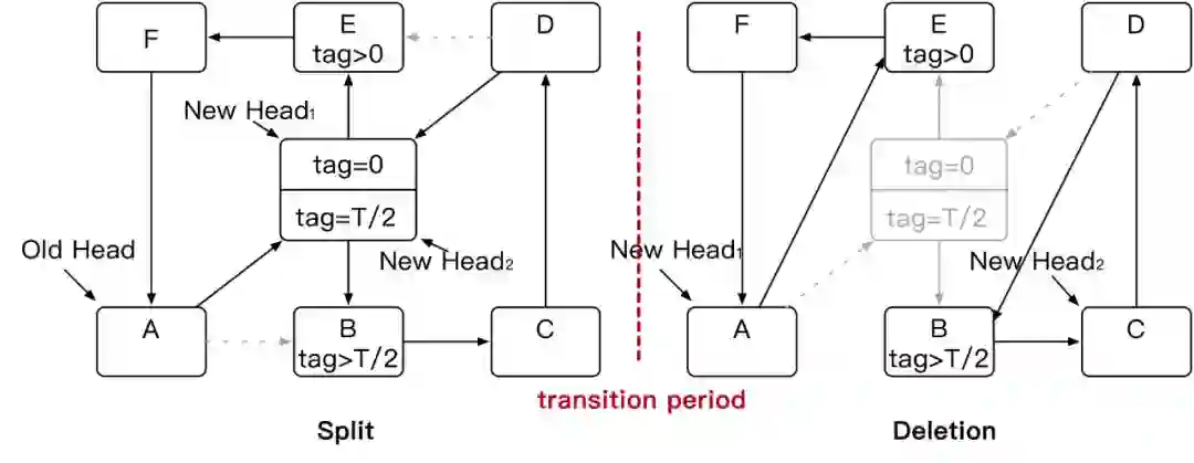 分裂(Split):在分裂阶段,rehash线程通过将rehash节点的两个子item节点插入环中完成环的分裂。如图(Split)所示,因为itemB和E是tag的范围边界,所以子item节点分别插入到itemB和E之前。完成两个插入操作后,新哈希表将激活,所有的访问都将通过新哈希表进行访问。到目前为止,已经在逻辑上将冲突环一分为二。当我们查找数据时,最多只需要扫描一半的item。