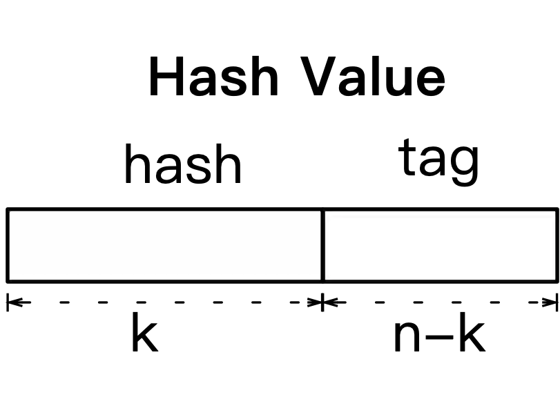 如下图所示,tag是哈希值的一部分,每个key计算的哈希值,前k位用来哈希表的定位,后n-k位作为冲突链中进一步区分key的标志。为了减小排序开销,我们构建字典序:order = (tag, key)。先根据tag进行排序,tag相同再根据key进行排序。