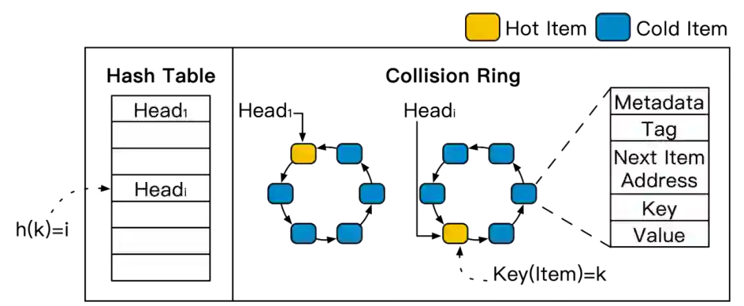 HotRing在传统链式哈希索引基础上,实现了有序环式哈希索引设计。如下图所示,将冲突链首尾连接形式冲突环,保证头指针指向任何一个item都可以遍历环上所有数据。然后,HotRing通过lock-free移动头指针,动态指向热度较高的item(或根据算法计算出的最优item位置),使得访问热点数据可以更快的返回。