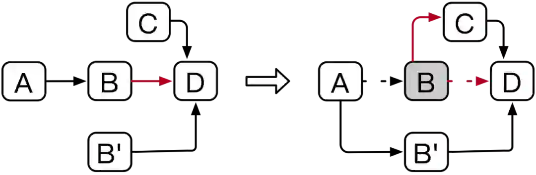 如下图所示,在链A->B->D上,线程1进行插入C的操作,同时线程2进行RCU更新B的操作,尝试更新为B'。线程1修改B的指针指向C,完成插入。而线程2修改A的指针指向B'完成更新。两个线程并发修改不同的内存,均可成功返回。但是这时遍历整条链(A->B'->D),将发现C无法被遍历到,导致正确性问题。