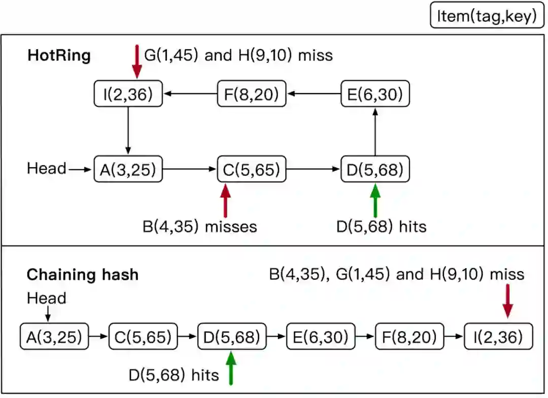 下图比较了HotRing与传统链式哈希。以itemB举例,链式哈希需要遍历所有数据才能返回read miss。而HotRing在访问itemA与C后,即可确认B read miss。因此针对read miss操作,链式哈希需要遍历整个冲突链;而HotRing利用字典序,不仅可以正确终止,且平均只需遍历1/2冲突环。