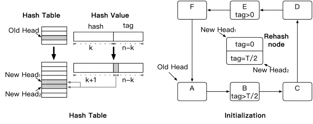 初始化(Initialization):首先,HotRing创建一个后台rehash线程。该线程创建2倍空间的新哈希表,通过复用tag的最高一位来进行索引。因此,新表中将会有两个头指针与旧表中的一个头指针对应。HotRing根据tag范围对数据进行划分。假设tag最大值为T,tag范围为[0,T),则两个新的头指针对应tag范围为[0,T/2)和[T/2,T)。同时,rahash线程创建一个rehash节点(包含两个空数据的子item节点),子item节点分别对应两个新头指针。HotRing利用item中的Rehash标志位识别rehash节点的子item节点。