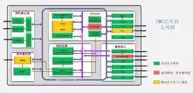 这个是我们芯片内部的一个结构,在这个图里也标出来了,绿色部分完全是我们自主研发的,红色部分是我们芯片里面一些通用的模块、IP,其他还有一些黄色部分,就是芯片代工厂提供的一些 IP,整个的芯片我们做到了自主可控。