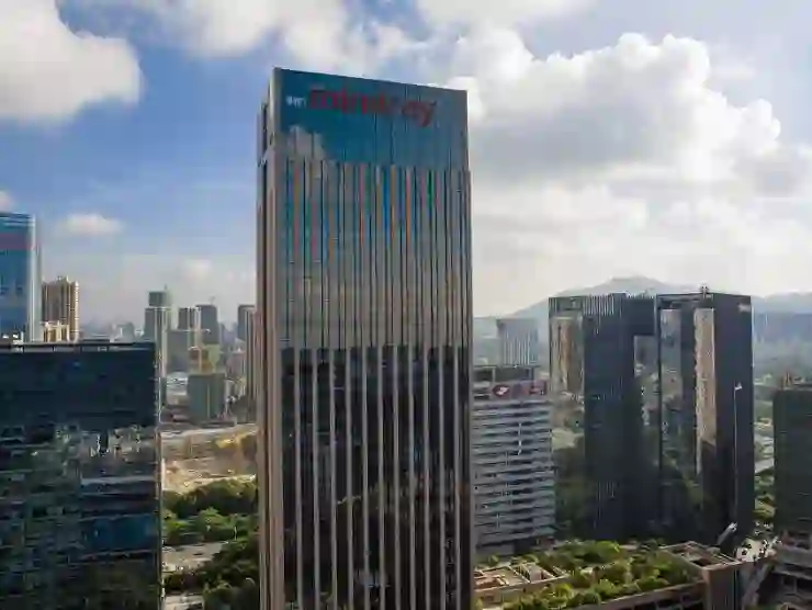 与周围的玻璃幕墙不同的是,迈瑞的外墙上用的是砖红色的火烧石,这也让这座大厦显得异常厚重。