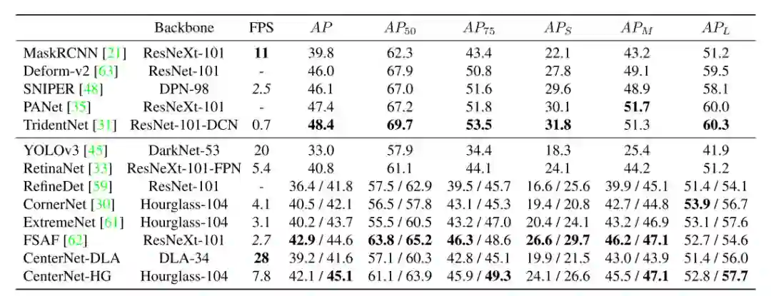 在8卡TITAN-V GPU上,ResNet-101和DLA-34训练了2.5天,Hourglass-104训练了5天。在COCO验证集上测试,结果如下图所示: