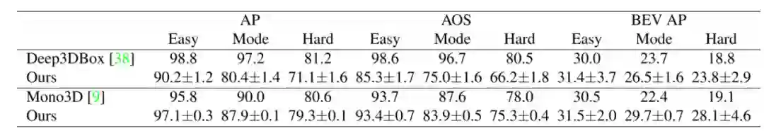 在测试时,recall的值设置为从0到1步长为0.1的11个值,IOU阈值为0.5,计算2D bounding box的AP、度量角度准确性的AOS、鸟瞰图bounding box的BEV AP。针对该数据集训练5个模型,测试结果取5个模型平均值,并给出标准差。